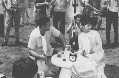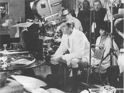 There was obviously quite a bit of waiting around as the lighting was set for a scene particularly with the added difficulties up at Piz Gloria. As Michael Reed explains, "Our big problem was, of course, the whole 360 degree interior there was glass and every time we put a lamp up it was reflected in the glass. So we had to flag everything off so that you couldn't see any of the highlights from the lamps itself. Obviously that took time and it was quite something, but even then we still kept fairly to schedule. It wasn't easy by a long way!"