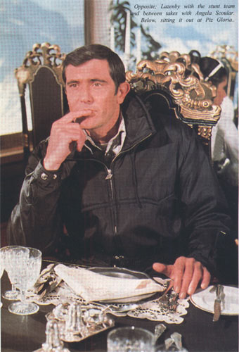 He also found himself pestered by the local girls, but he was better able to cope with that. "Well, I was pestering them too because, bear in mind, I was a single guy." He was also enjoying the pampered lifestyle of a movie star. "It wasn't too bad for me. I had the run of the place. I could have anything on the menu; I didn't have to eat the film food! I could have the best wines, the best food. I could go to any restaurant. I could do whatever I liked up there and also I had all those girls to entertain me. They were fun. They had their boyfriends coming backwards and forwards, so we all had a great time." The stunt crew on the film have nothing but praise for Lazenby and his co-operative behaviour on what was mainly second-unit work, especially as any kind of physical effort took its toll at such a high altitude. Alf Joint was one of the stuntmen on the film and remembers just how bad it could be. "One of the sparks passed out just trying to change his overalls. The air was so thin, you realised it then. I thought it was a heart attack, but it's just that he'd passed out through lack of oxygen humping all those big Brutes about." Michael Reed adds, "It was pretty tough for them up there because there's quite a difference. Amazing, really." Reed also recalls another unusual phenomenon. "The other thing was the amount of static that was in the actual restaurant area. The hairdressers used to go to George to get his hair right, comb his hair, and you would actually see a flash from the fingers onto George! It was quite something. As a matter of fact he got upset a couple of times because it's such a startling thing." Of Lazenby, Alf recalls "I used to chat quite a lot to him. I don't know what it is, but it was hype: they said he was arrogant. Well, he was always very gentle with kids and he was never rude. Every time I was in contact with George he was as sweet as a nut. I never heard him say a thing wrong. He was always chatting to the girls and helping them out in shots." George Leech's impression of the star was similarly favourable.