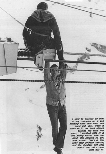 on it and climbing hand over hand and doing pull ups. So I thought to myself, 'Well, I've rot all the strength to do this,' but I never reckoned that I would slip and dislocate the arm. That finished my tricks on the cable.