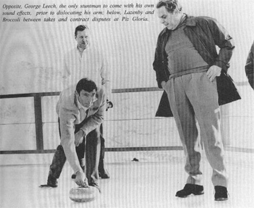 "Extensive tests began in April with the five potential Bonds, much of it centring on how well they each performed physically in the fight scenes. George Leech, who had previously worked as an assistant to stunt and fight arranger Bob Simmons was in control on this film as Simmons had gone off to Spain to work with Sean Connery on Shalako. Leech and the film's director of photography, Michael Reed, both met on Broccoli's Chitty Chitty Bang Bang, for which he did the second unit work just prior to OHMSS.