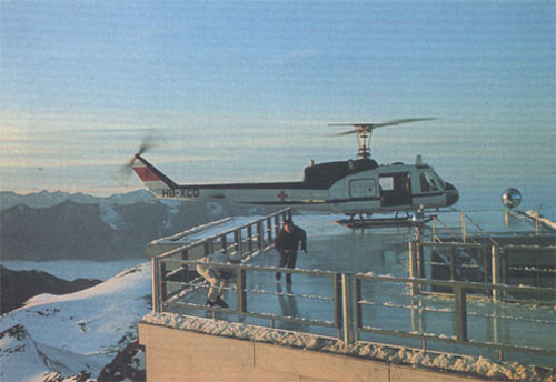 What had been found was a restaurant that was being built on top of the Schiltorn ('Magic Mountain') in the Bernese Overland. From its peak at 9744 feet (2970 metres) it offers one of the best views of the Alps. To the north can be seen the Swiss Lowlands, the Jura and the Black Forest, which as you look round give way to the Alpine range dominated by the Eiger, Monch, and Jungfrau. The building of the restaurant had started in 1961 with helicopters carrying the building materials up to the peak. Syd Cain recalls the state of the construction when he first saw it.