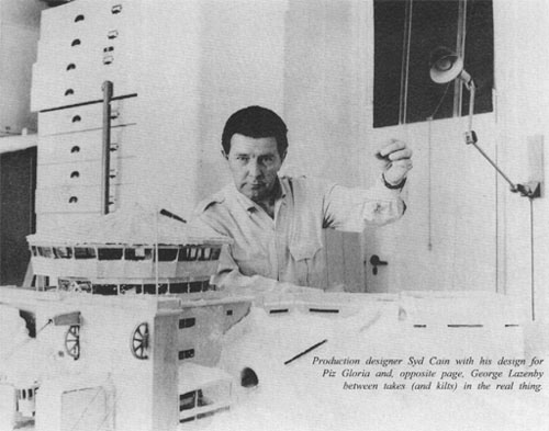 The various locations for the filming, which was scheduled to begin in the Autumn, alreadybeen found. The script closely followed Fleming's book and most of the locations were not too problematic to find in both Portugal and Switzerland. The one difficulty had been in finding a suitable site for Blofeld's mountain fortress, Piz Gloria. Syd Cain, who had previously worked on Dr No (Although uncredited in error) and From Russia With Love, was the production designer and had begun looking for suitable locations in the winter of 1967/8. The initial possibility was very different to the final solution, as he recounts.